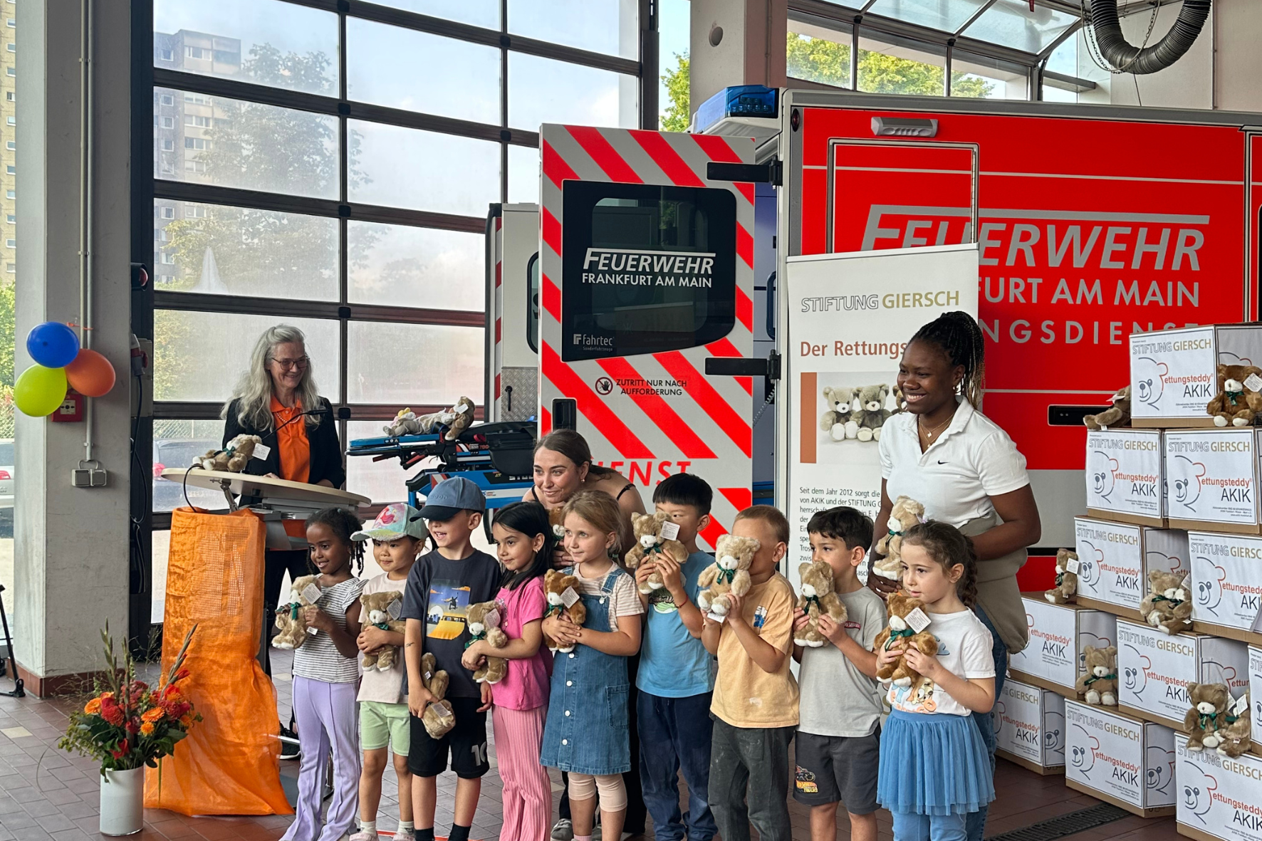 Frau Senatorin E.h. Karin Giersch übergab die plüschigen Helfer offiziell in den Dienst – eine Tradition, die dank der langjährigen Unterstützung der STIFTUNG GIERSCH seit vielen Jahren Kindern in Notlagen Trost und Halt spendet. Grußworte des Oberbürgermeisters überbrachte Frau Stadträtin Annette Rinn, Dezernentin für Sicherheit, Ordnung und Brandschutz.