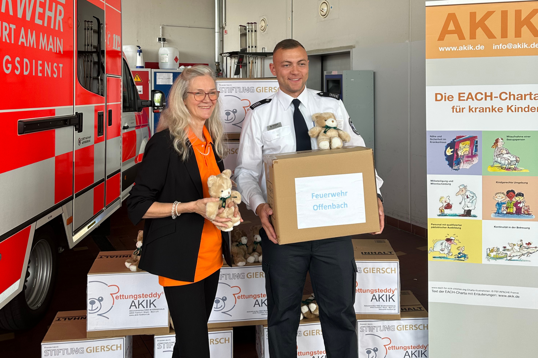 Am 27. August 2025 fand im Brandschutz-, Katastrophenschutz- & Rettungsdienstzentrum (BKRZ) Frankfurt die feierliche Übergabe von über 5.000 AKIK-Rettungsteddys® statt.